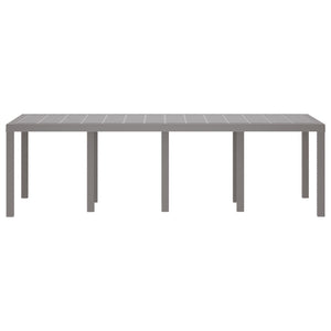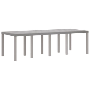 Esta mesa de pátio, feita de metal resistente, apresenta um acabamento cinzento-claro elegante, sendo uma ótima adição a qualquer área exterior. É ideal para grandes encontros e combina praticidade com um toque moderno, adequada tanto para eventos descontraídos como formais.
