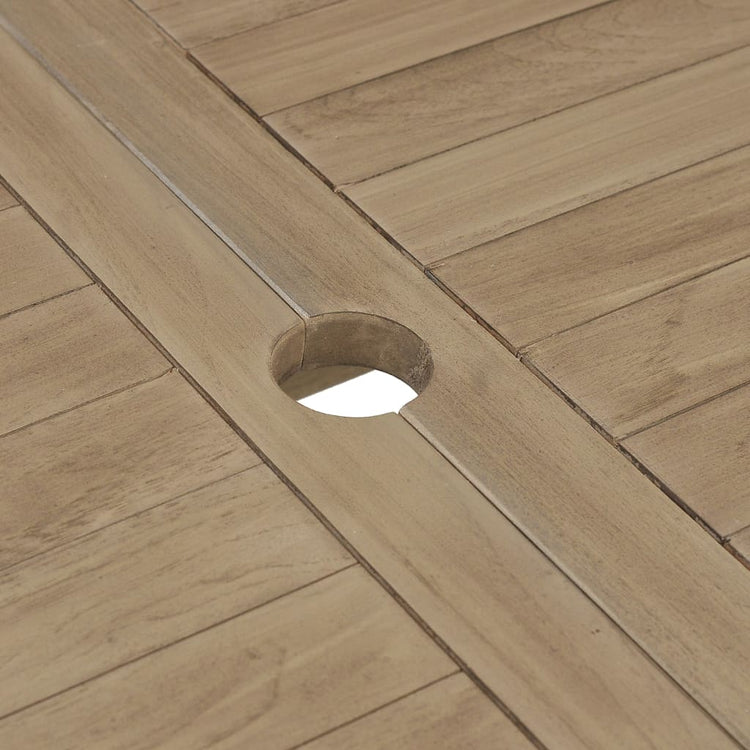 - Orifício para guarda-sol: o tampo da mesa possui um orifício para que possa colocar um guarda-sol e criar um espaço com sombra.
