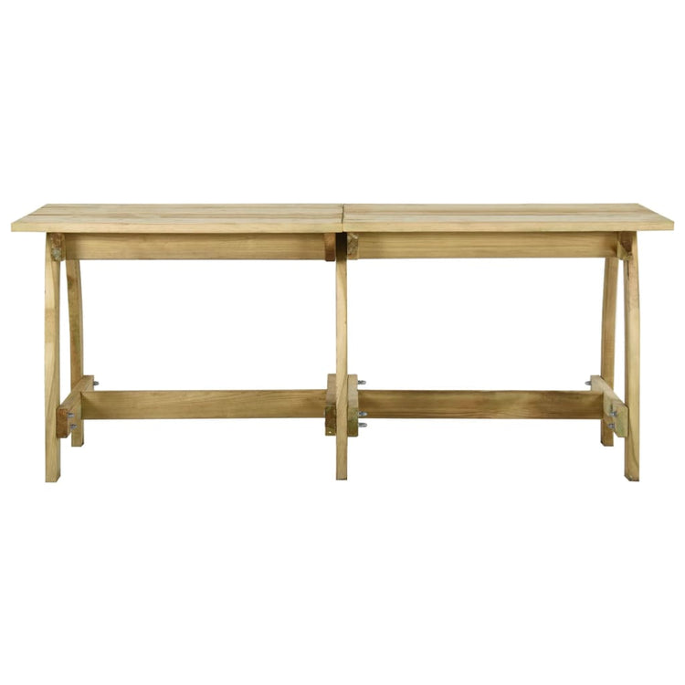 Feita de pinho impregnado a verde, esta mesa de exterior em madeira é muito robusta, durável e resistente à corrosão. A mesa de pátio é uma escolha ideal para momentos relaxantes num jardim romântico de uma casa de campo ou perto de um lago com um jardim idílico, para jantar com a família e amigos. Note que a madeira é um produto natural e pode mostrar imperfeições.