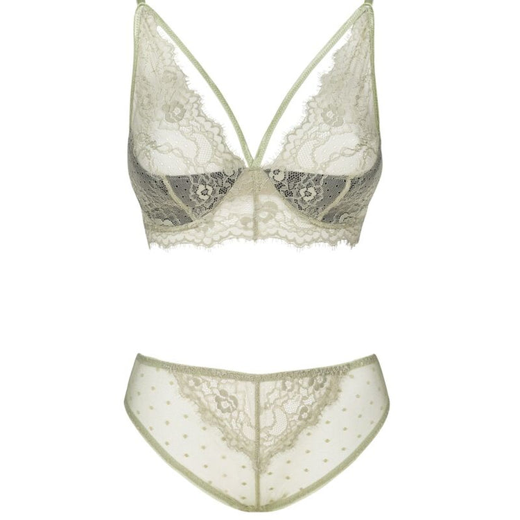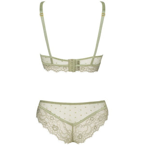 O conjunto de lingerie é uma obra de arte em renda. O sutiã não é rígido e é equipado adicionalmente com duas alças no decote, portanto, ao espreitar por baixo de uma camisa ou blusa, certamente chamará muita atenção. O sutiã sustenta bem o busto, o que significa que mulheres com seios maiores também poderão usá-lo. A tentadora roupa íntima na cor off-green também inclui calcinhas de renda confortáveis e ao mesmo tempo sensuais, que, mesmo sendo um pouco mais construídas, ainda criam uma atmosfera sexy. O design da calcinha destaca perfeitamente as nádegas femininas, fazendo com que cada mulher se sinta especial. O conjunto é perfeito para uso diário e também para momentos um pouco mais especiais.