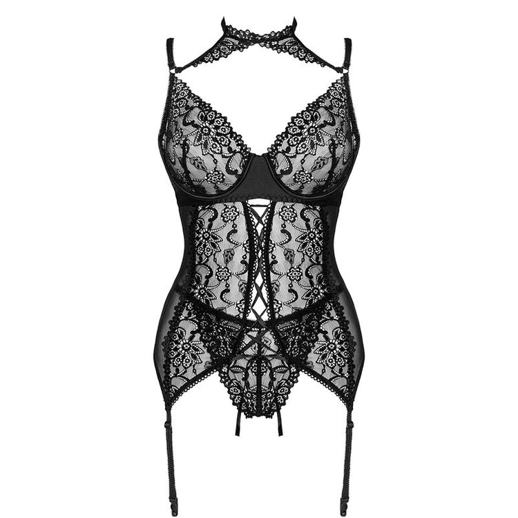 O espartilho Gielandra para os sentidos é um conjunto da luxuosa marca polaca LivCo Corsetti Fashion, composto por 2 elementos - um espartilho e uma tanga. A cueca é na clássica cor preta. O espartilho é preso com ganchos, o que permite ajuste e garante conforto. Também é possível ajustar o comprimento das alças e prender meias, o que diversificará bastante o estilo. Esta é uma proposta perfeita para mulheres que valorizam o conforto, mas não querem abrir mão de uma aparência sensual. A cueca é confeccionada em 90% poliamida e 10% elastano. Essa combinação de materiais torna o look muito flexível e não restringe os movimentos. O conjunto inclui inserções decorativas feitas de renda durável que enfatizam as formas femininas em todos os lugares mais importantes. O corte e a amarração na barriga tornam o espartilho sofisticado e ao mesmo tempo deixam espaço para a imaginação. Um elemento inusitado é uma gargantilha que vai chamar a atenção para o pescoço e as clavículas. Este espartilho sexy certamente irá apimentar muitas noites românticas.