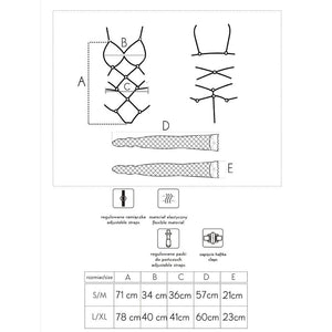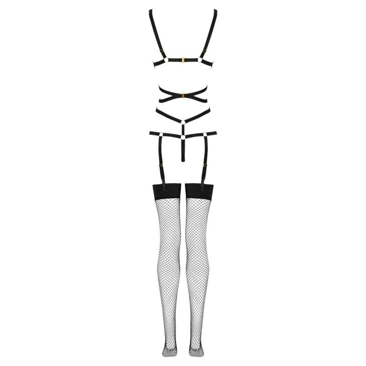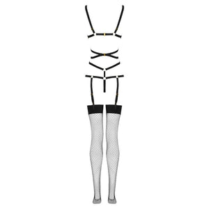 A parte superior do conjunto é composta por sensuais listras pretas, entrelaçadas na barriga e conectadas por anéis. As alças na parte superior envolvem elegantemente o busto sem cobri-lo, enquanto na parte inferior transformam-se suavemente em tanga. Alças individuais percorrem ambos os lados da tanga, abraçando charmosamente os quadris. A parte inferior do conjunto é composta por meias pretas de comprimento ajustável, confeccionadas em malha. As meias são presas com fechos na parte superior do traje, na frente e nas costas.