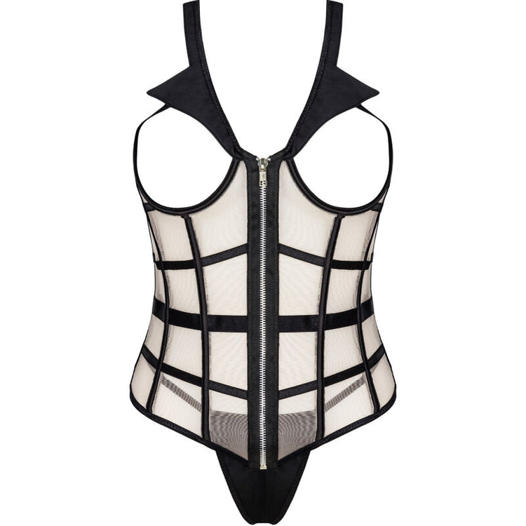 Um conjunto de duas peças composto por um espartilho sensual e busty e uma tanga preta sexy. O espartilho tem um zíper na frente, tornando-o fácil de vestir. As cores do conjunto são preto e bege, que juntos criam uma combinação atraente. Também vale a pena prestar atenção aos detalhes tentadores, como uma gola preta ou cintos pretos dispostos de forma a destacar melhor a cintura. O que mais se destaca neste espartilho são os recortes que expõem o busto. Isso torna todo o conjunto muito ousado e provocativo. Não resta muito para a imaginação. Os adesivos de mamilo serão uma ótima adição ao jogo e adicionarão um pouco de tempero.