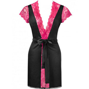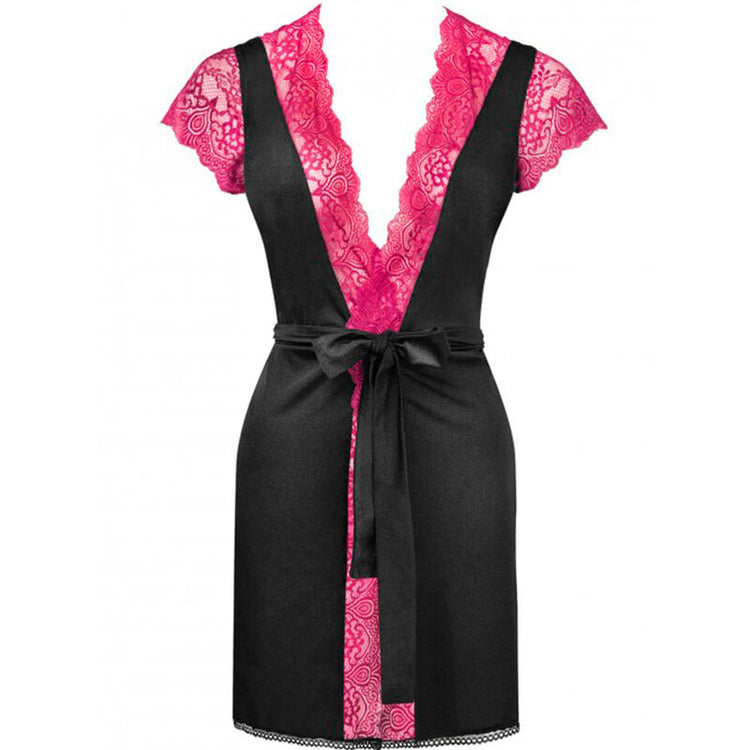 Se você ainda não se convenceu a usar lingerie, é hora de. Este da coleção Kumiko vai fazer sucesso e com certeza você vai se apaixonar por esse roupão. Tudo isso é possível graças à combinação única de renda de bom gosto e delicada microfibra. Além disso, o conjunto inclui cuecas. O roupão apresentado é lindo, e a cor preta e bordô combina perfeitamente com o acabamento em renda nas bordas. Uma vantagem adicional é o efeito de cintura acentuada graças à gravata de cetim na cintura. O produto é feito de um material delicado e agradável. 90% poliamida, 10% elastano.