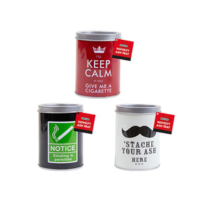 Feitos de folha de flandres durável, apresentam gráficos cómicos impressos. Cada cinzeiro tem 10 cm de altura e vem com uma tampa removível que contém vários furos que permitem que as cinzas caiam no compartimento inferior.