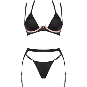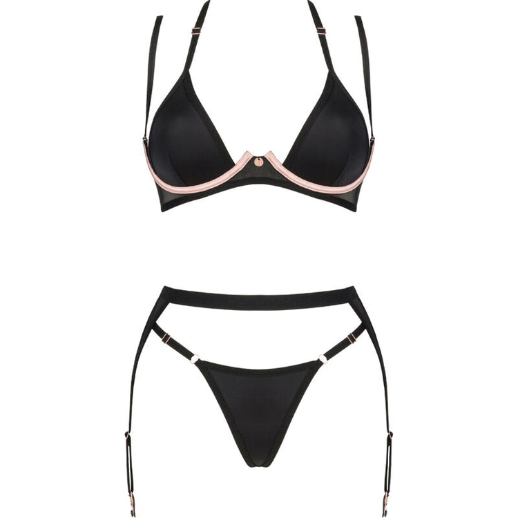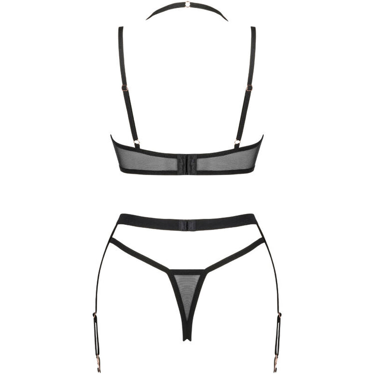- um conjunto preto de três peças contendo sutiã, tanga e cinta-liga