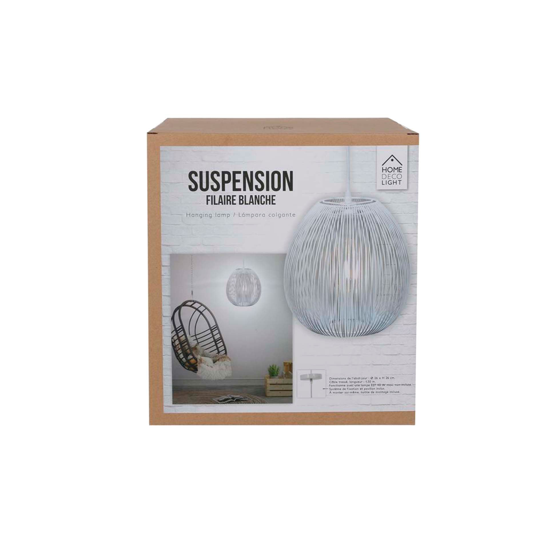 Você gosta da tendência do fio? Você vai adorar o charme desta suspensão de bola com um design ultra-arejado! Este modelo, sem dúvida, encontrará seu lugar acima de uma sala de jantar ou ao lado de um sofá, sucesso garantido, Características Técnicas: Dimensões 26x26 cm - Cabo trançado - Comprimento do cabo: 1,50 m - Trabalhos setoriais - Entrada: 220-240V AC - 50/60Hz - Funciona com uma lâmpada máxima E27 40W nãousificada - Aviso incluído - Sistema de fixação e pavilhão incluído,