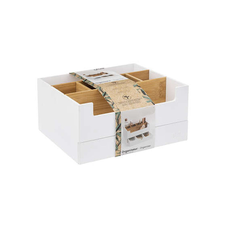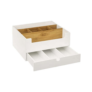 Organizador grande com gaveta inferior com 3 compartimentos internos e parte alta com divisória removível de bambu com 6 compartimentos. Material: MDF e bambu.