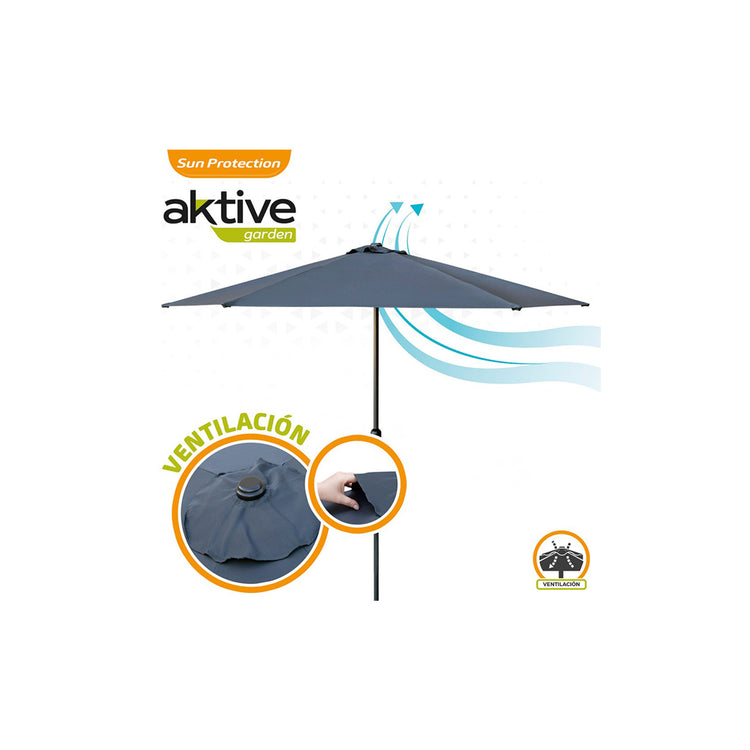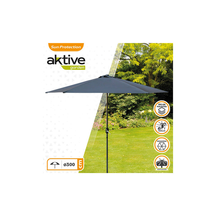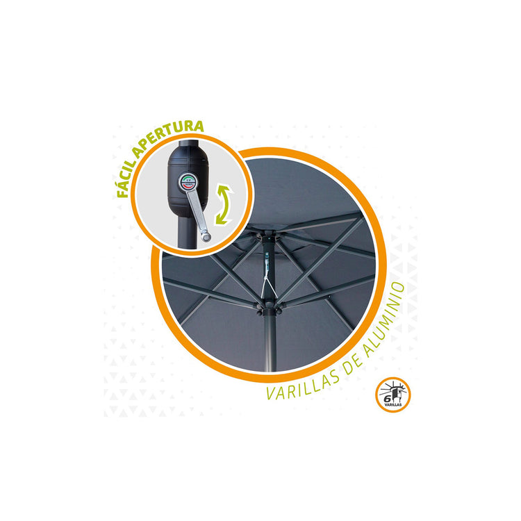 Guarda-sol para jardim ou terraço. Forma hexagonal e diâmetro de 300cm, altura 240cm. Material 100% poliéster 150 gr / m2 na cor cinza antracite, ideal para exteriores. Com abertura e fecho através de uma manivela rotativa. Quadro de alumínio com 6 hastes e mastro de 38 mm. Teto duplo tipo chaminé para melhorar a passagem do ar e dar maior estabilidade.