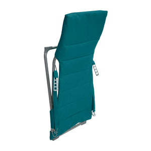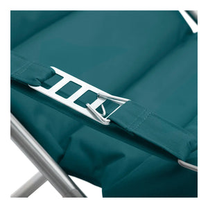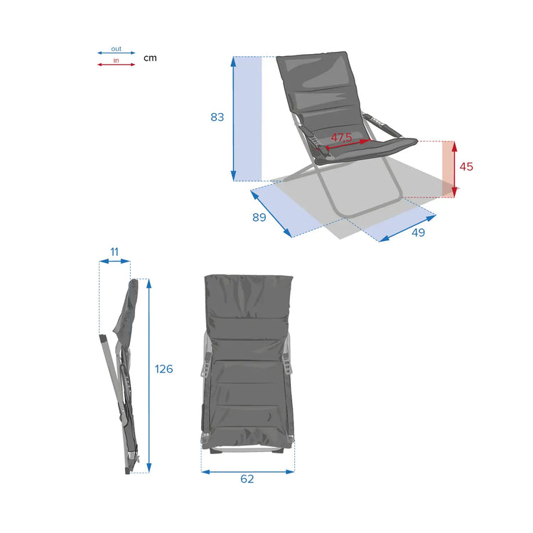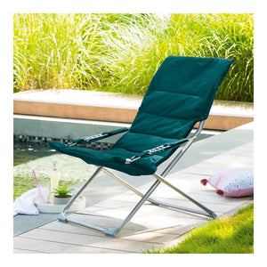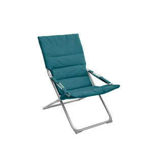 Espreguiçadeira acolchoada. Poltrona muito confortável graças ao seu assento e encosto acolchoados. Reclinação 3 posições. Dobrável para fácil transporte e economia de espaço. Dimensões dobrado 126x62x11 cm. Pintura epóxi antiferrugem reforçada por galvanoplastia. Almofada em poliéster 230 g/m2, cor azul pato. Dimensões 89x62 cm, altura 83 cm.