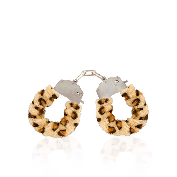 Fabulosas algemas de duas peças ligadas por uma corrente de aço cromado, cobertas com uma pelúcia macia ao redor das algemas cor de leopardo