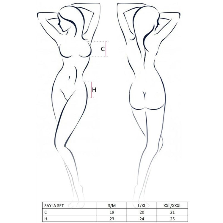 O conjunto da coleção Sayla é um fabuloso conjunto de lingerie com um design espetacularmente sexy com o qual você se tornará uma bomba de sedução, fabricado pela prestigiada marca de lingerie Passion