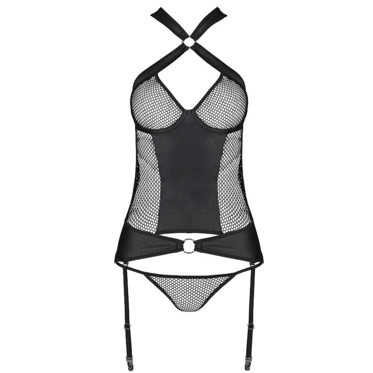 O espartilho Amanda é uma combinação inovadora de couro por trás de uma malha sensual, cuja tarefa não é apenas revelar sedutoramente o que há de mais feminino, mas também enfatizá-lo. As juntas douradas em forma de rodas dão todo o carácter.