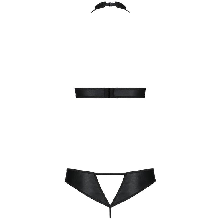 Malwia é um conjunto composto por um top de couro preso no pescoço com argolas decorativas e cordões, que valoriza e valoriza o busto e a tanga com recorte charmoso. As juntas decorativas em forma de círculos dão um charme peculiar.