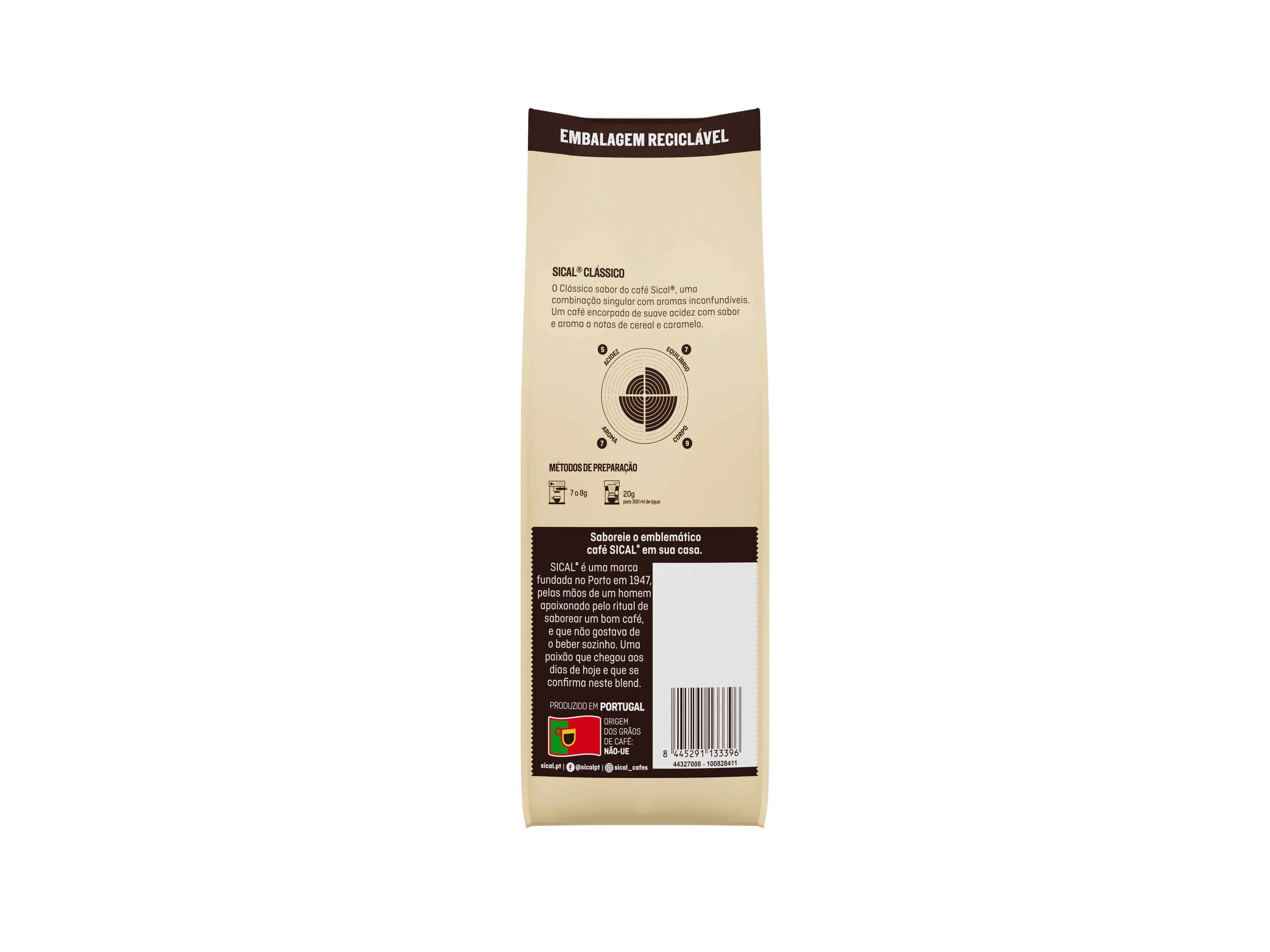 O Café Torrado Clássico Moagem Normal SICAL é composto por uma seleção cuidada de grãos arábica e robusta. Combina de forma equilibrada corpo, sabor e aroma. Suave, agradável e harmonioso, é ideal para beber depois de uma refeição ou para fazer uma pausa ao longo do dia. É o café perfeito para agradar a diferentes paladares, proporcionando momentos de verdadeiro aconchego.