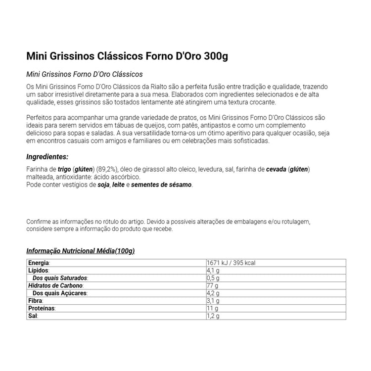 Os Mini Grissinos Forno D'Oro Clássicos da Rialto são a perfeita fusão entre tradição e qualidade, trazendo um sabor irresistível diretamente para a sua mesa. Elaborados com ingredientes selecionados e de alta qualidade, esses grissinos são tostados lentamente até atingirem uma textura crocante.