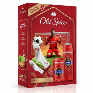 Frescura inacreditável 24 horas por dia, 7 dias por semana,* com os conjuntos de oferta Old Spice! Procuras o presente perfeito para o fã de futebol que vive para o jogo, demonstra espírito de competição e uma fragrância lendária? Não procures mais! O con junto de oferta inclui o desodorizante Captain em stick e o gel de banho para homem, juntamente com um estiloso par de meias, tudo elegantemente embalado numa caixa de cartão com o design Footballer. Não há como errar com a fragrância de qualidade Old Spi ce Captain: a fragrância das ondas do mar impetuosas, do sândalo e da bergamota picante vai transformar-te no destemido capitão de frescura. Como é que este conjunto de oferta Old Spice ainda não está no teu carrinho? (* com utilização de gel de banho e desodorizante).