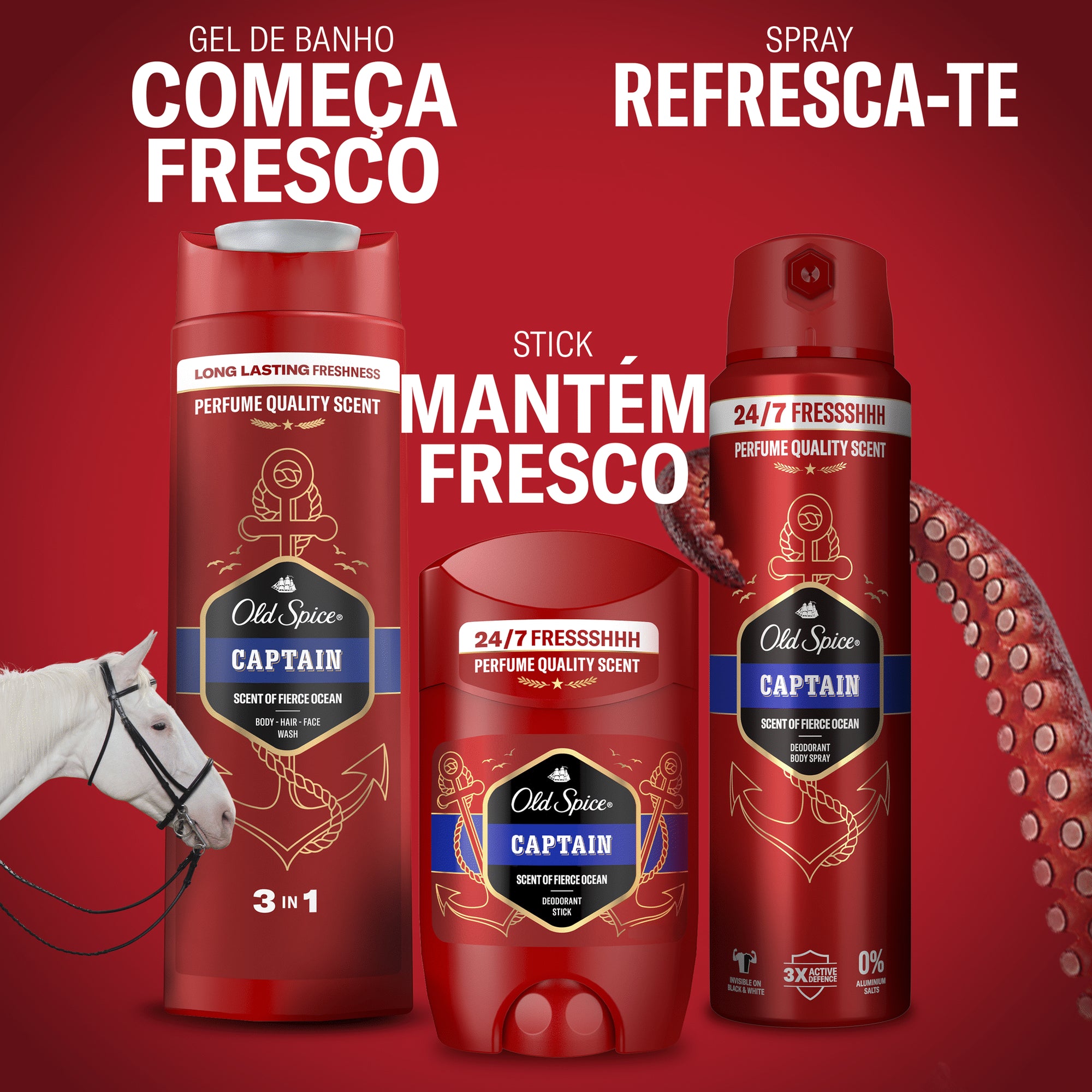 Desfruta de frescura durante todo o dia* e de confiança aromática com o spray desodorizante Old Spice Captain. Com este nível de frescura sem preocupações, podes concentrar-te em atividades mais importantes, como fechar negócios ou ensinar golfinhos a falar. A fórmula 3x Active Defence: Perfume duradouro/ Proteção contra odores/ Com eliminadores de odores; combate o mau odor antes de começar e sobrepõe-se até ao cheiro mais intenso com um aroma fantástico. A fragrância de qualidade das ondas do mar impetuosas, apimentada com sândalo e bergamota, transforma-te num destemido capitão de frescura numa fantástica aventura pelos sete mares da elegância. Ah, e mencionámos que contém 0% de sais de alumínio, sendo invisível em roupas pretas e brancas? Porque sim. * com utilização diária