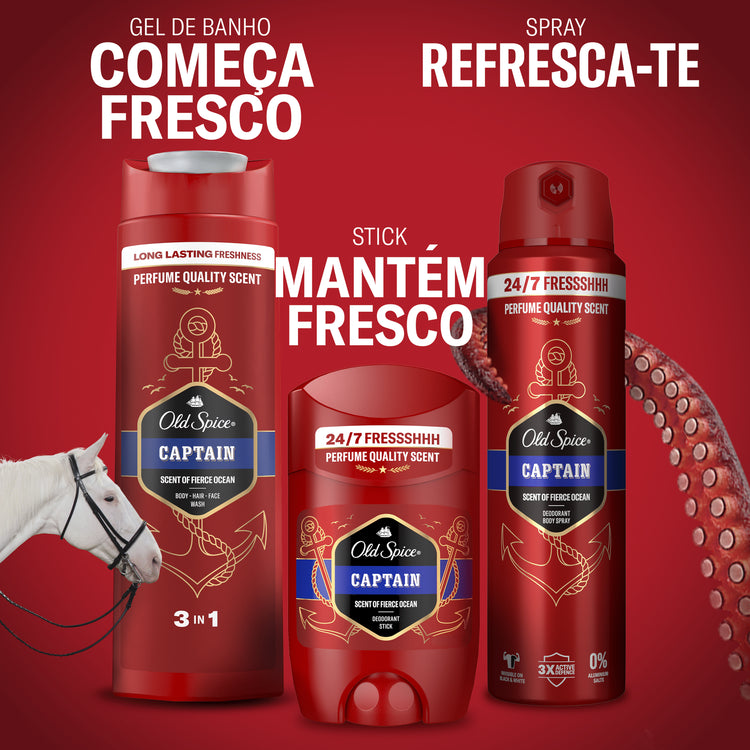 Desfruta de frescura durante todo o dia* e de confiança aromática com o desodorizante em stick Old Spice Captain. Com este nível de frescura sem preocupações, podes concentrar-te em atividades mais importantes, como fechar negócios ou ensinar golfinhos a falar. Experimenta o desodorizante em stick para uma proteção forte contra odores nas axilas com uma aplicação fácil e seca (vs o desodorizante Old Spice Spray). A fórmula 3x Active Defence: Perfume duradouro/ Proteção contra odores/ Com os eliminadores de odores, combate o mau odor antes de começar e sobrepõe-se até ao cheiro mais intenso com um aroma fantástico. A fragrância de qualidade das ondas do mar impetuosas, apimentada com sândalo e bergamota, transforma-te num destemido capitão de frescura numa fantástica aventura pelos sete mares da elegância. Ah, e mencionámos que contém 0% de sais de alumínio, sendo invisível em roupas pretas e brancas? Porque sim. * com utilização diária