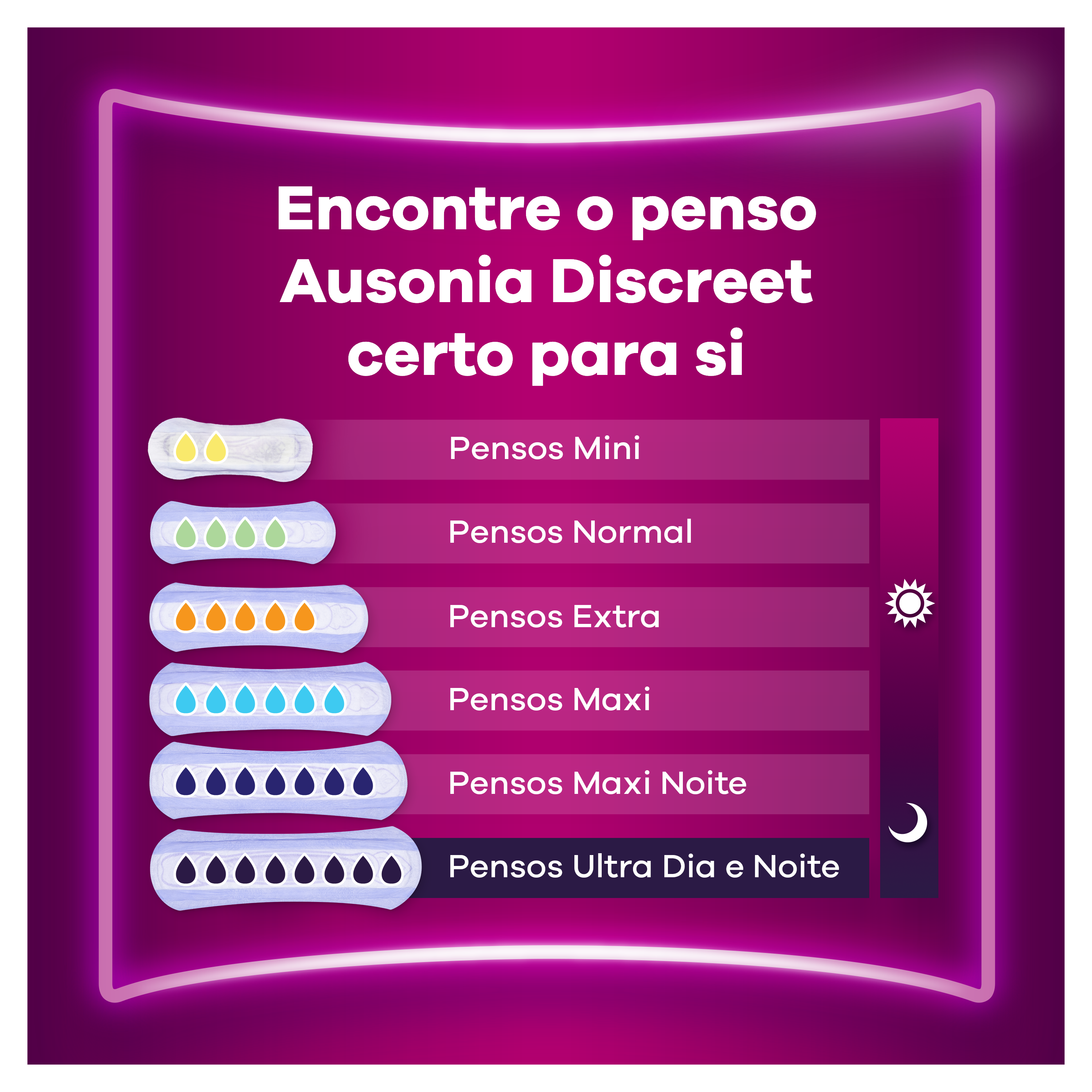 Para perdas frequentes e moderadas, quando os pensos de absorção mais ligeira já não são suficientes, experimente os pensos Ausonia Discreet. Absorvem as perdas de urina e odores em segundos, para que se mantenha fresca e confortável durante todo o dia. Com barreiras protetoras que ajudam a evitar fugas, os pensos estão disponíveis em três níveis de absorção (Normal, Extra e Maxi Dia & Noite) para se adaptar às suas necessidades. Ausonia Discreet para perdas de urina oferece a melhor proteção da Ausonia contra a sensação de humidade, para pessoas com uma bexiga hiperativa ou incontinência urinária.