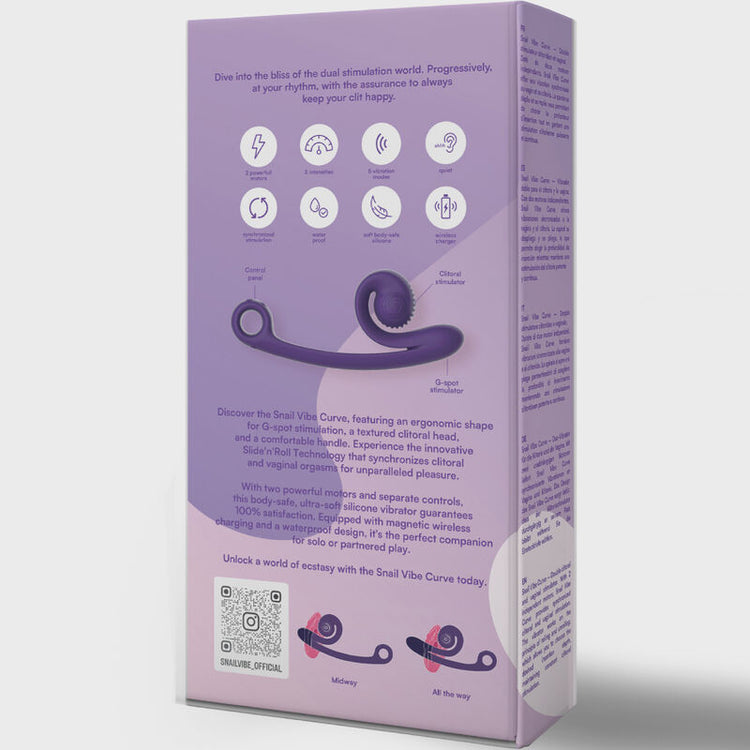 Descubra o Snail Vibe Curve, com formato ergonômico para estimulação do ponto G, cabeça do clitóris texturizada e alça confortável. Experimente a inovadora tecnologia Slide'n'Roll que sincroniza os prgasmos clitorianos e vaginais para um prazer incomparável.